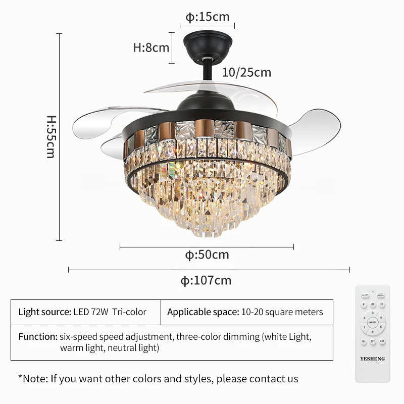 YeshengDer Y113 Kristall-Lüster-Ventilator von Yesheng ist eine faszinierende Kombination aus Schönheit und Funktion. Dieser Deckenventilator hat einen Durchmesser von 42 Zoll und ist mit funkelnden Kristalllüstern verziert, di...